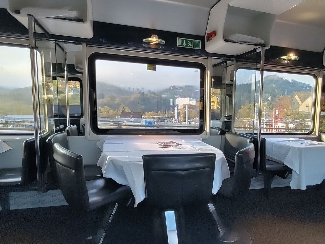 | Interior of a SBB CFF FFS WRm 88-94 EW IV dining car with its characteristic semicircular five-seat tables in the IC 558 Wien - Graz on 2026-04-11 (serviced by DoN). |