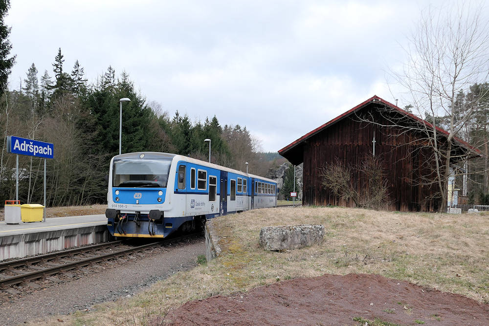 CD - Czechia The regional railway line between Trutnov and Teplice nad Metuji is operated by RegioMouse diesel trainset class 814/914. Trainset 814 104 is seen before departure from Adrspach. Adrspach, 04-04-2026 Photo by Marco van Uden |