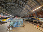 A 3 high speed EMUs SIEMENS Velaro, owned by EIL ("Eurostar International Limited") at railway station London St. Pancras, using an international trains.