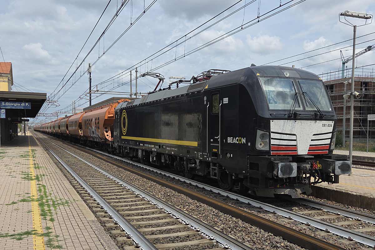Operatig for RTC Rail Traction Company in the full color of the leasing company BEACON RAIL, electric loco 191 034 (NVR 91 83 2191 034-4 I-DISPO) pulls its southbound hopper train on track 2 at San Giorgio di Piano BO station. 06/08/2025.