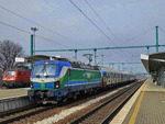 A private electric locomotive SIEMENS Smartron with number 91 52 10 80 032 - 1 , owned by private operator "Bulmarket" at railway station Iskar with freight train.