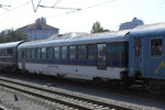 A sleeping car of MAV (Magyar Allam Vasutak / Hungarian Railways) type "WLS" with number 56 55 89 69 052 - 0 at central railway station Sofia in composition of an attraction train.