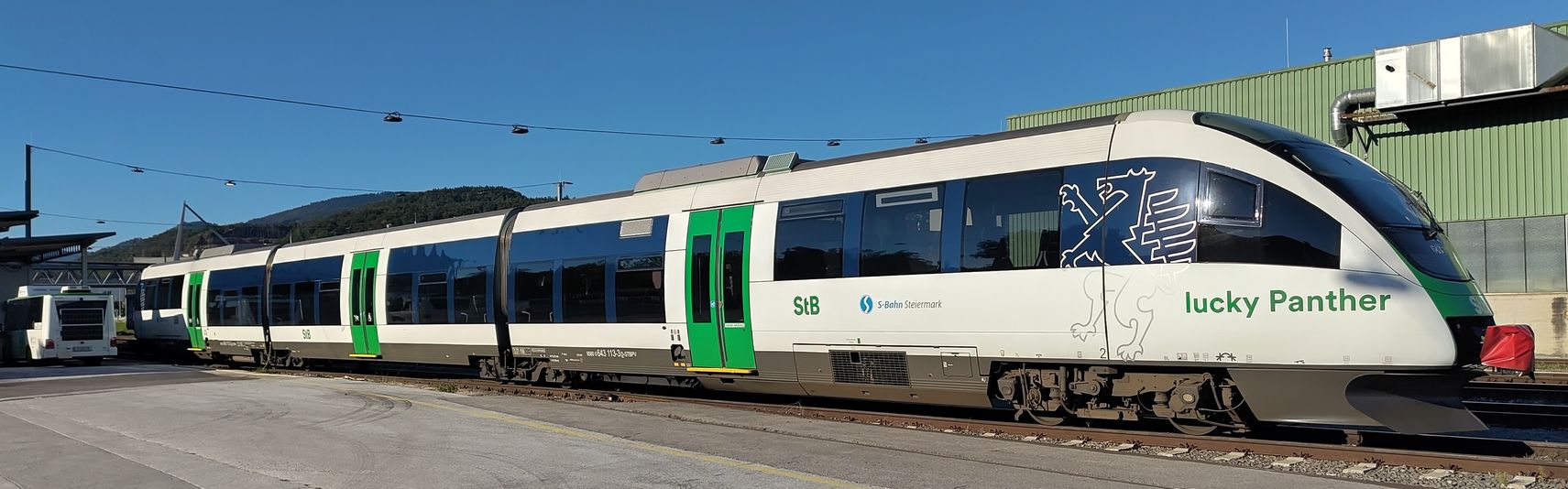 95 80 0643 113-3 D-STBPV "lucky Panther". Originally built 1998 by Talbot Aachen for Alpha Trains, used by Ostmecklenburgische Eisenbahngesellschaft from 1999, Ostseeland Verkehr from 2006, Nord-Ostsee-Bahn from 2006, Bayerische Oberlandbahn from 2013, in 2023 it was sold to StB. Weiz, 2025-10-03. |