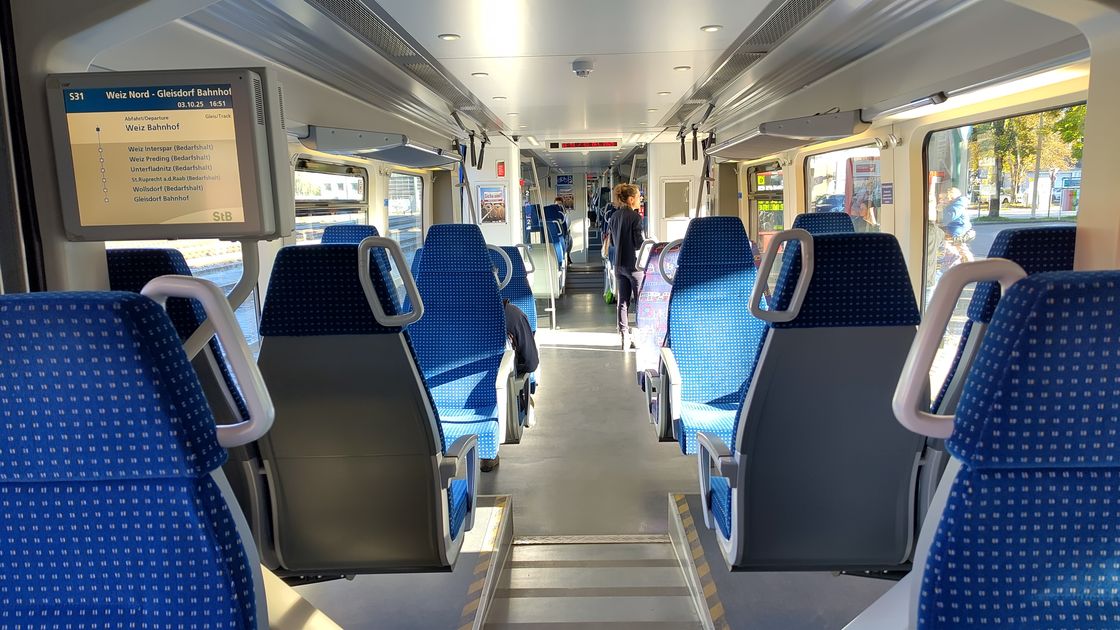95 80 0643 115-8 D-STBPV (diesel-hydraulic Talent), interior. Line S31 from Weiz to Gleisdorf, 2025-10-03. |