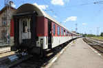 A private passenger car, type Avmz with number 61 80 19 91 347 - 3, owned by private operator "PIMK Rail Express", part of "PIMK Rail", standing at railway station Septemvri in composition of test train.