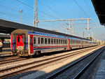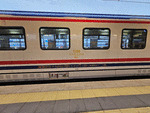 A passenger car "WSPlm" of TCDD ( Turkiye Cumhuriyeti Devlet Demiryollari / Turkish Railways ) standing at railway station HalkalI in composition of Ankara Ekspresi to Ankara.