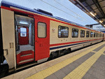 A sleeping car "WLAlm" of TCDD ( Turkiye Cumhuriyeti Devlet Demiryollari / Turkish Railways ) at central railway station Plovdiv in composition of International train with number 492 from Istanbul HalkalI to Sofia.