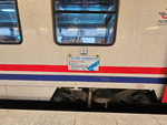 A restaurant car "WRlm" of TCDD ( Turkiye Cumhuriyeti Devlet Demiryollari / Turkish Railways ) standing at railway station HalkalI in composition of Ankara Ekspresi to Ankara.