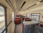 An interior in a restaurant car "WRlm" of TCDD ( Turkiye Cumhuriyeti Devlet Demiryollari / Turkish Railways ) standing at railway station HalkalI in composition of Ankara Ekspresi to Ankara.