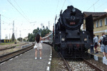 A steam locomotive with number 01.23 at railway station Vakarel with an attraction train.