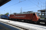 A private electric locomotive with number 91 52 20 86 006 - 7 , owned by private operator "Bulmarket" at central railway station Plovdiv with freight train.