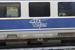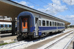 A second class passenger car of CFR (Caile Ferate Romane / Romanian Railways) type "B11mee" at central railway station Ruse in composition of International train with number 461 from Bucuresti Nord to Sofia.This car has a destination Bucuresti Nord - Varna and moves only during the summer.