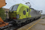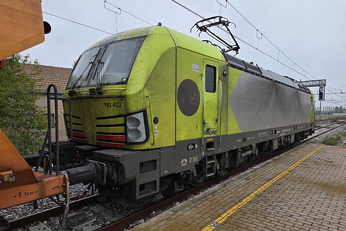 Operating for Lokomotion Gmbh, electric loco 193 403 (NVR 91 80 6193 403-3 D-ATLU) in full ALPHA TRAINS colors stops on track 3 at San Giorgio di Piano BO station. 22/10/2025.