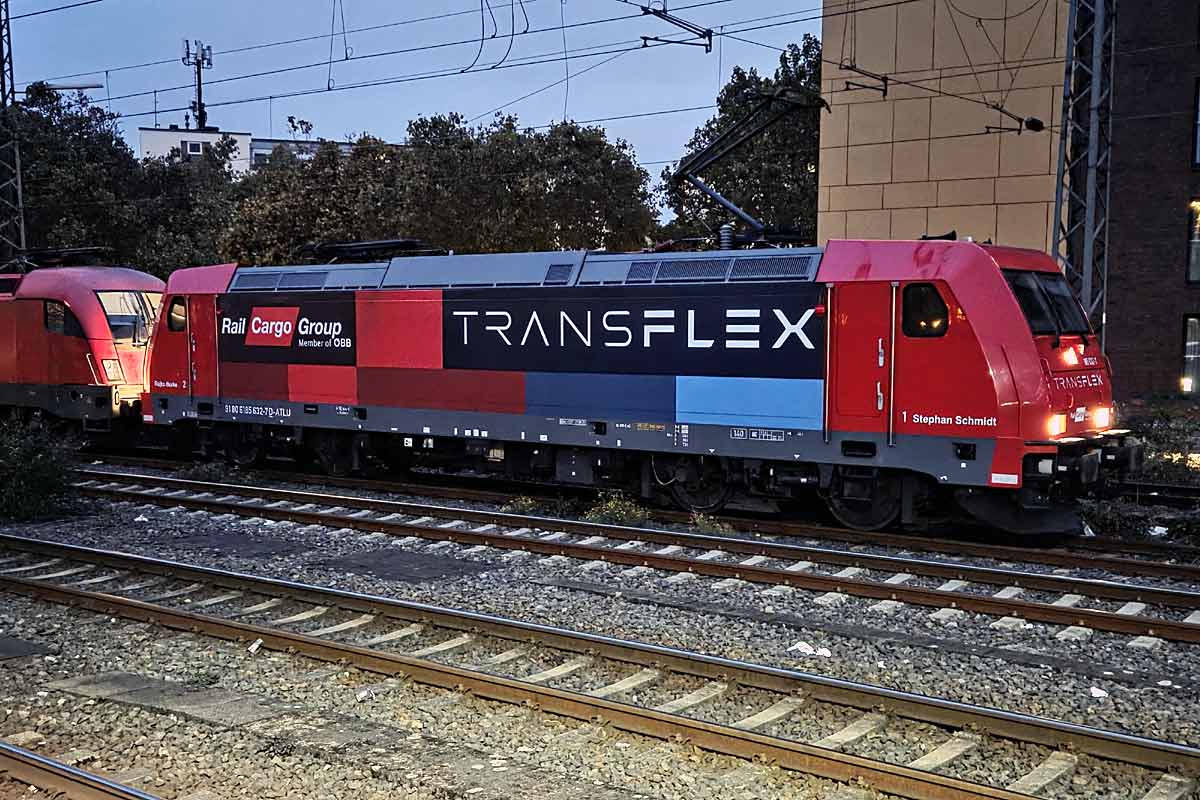 German Cargo operator Rail Cargo Logistics 8part of Austrian OBB Group) electric loco 185 632 (NVR 91 80 6185 632-7 D-ATLU) in special TRAnsFLEX colors stabled at Dusseldorf HBF. 13/10/2025