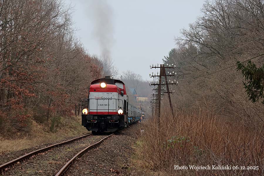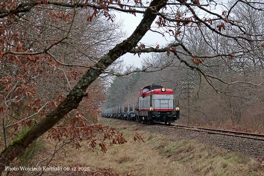 Trainspeed SM42-199, unloading of new rails on the modernized line is in progress 06.12.2025, track Nowa Wies Leborska - Garczegorze Photo W. Kolins |