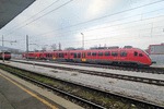 SZ Slovenske Zeleznice Slovenian Railways Bo'Bo' electric Loco class 342 "Mofa" nr 342-001 (NVR 91 79 1 342 001-9) at Ljubljana Central Station with a small consist of 3 OBB Coaches just arrived as EC 135 from Trieste Centrale Italy. 06/02/2024.