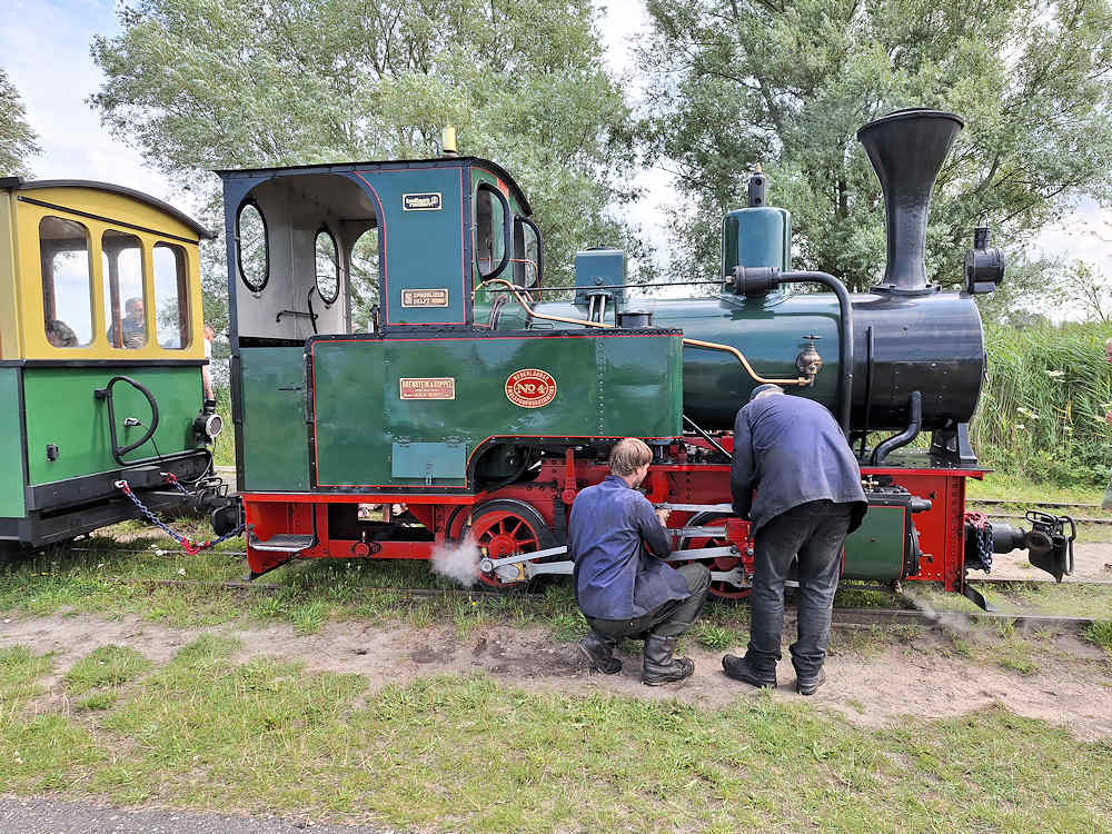 Stoomtrein Katwijk Leiden/National Narrow Gauge Museum - The Netherlands Steam locomotive 4 "K.A. Neve" makes a short stop halfway around the lake, for a quick check by the driver and stoker. This locomotive was built by O&K in Berlin in 1937, produces 50hp and has a maximum speed of 25km/h. Katwijk, 27-07-2024 Photo by Marco van Uden |