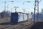 A private electric locomotive with number 91 52 20 86 009 - 1 , owned by private operator "Bulmarket" at railway station Popovica with freight train.