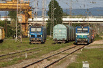 A private electric locomotive with number 91 52 31 86 015 - 5, owned by private operator "DB Cargo Bulgaria" at railway station Pazardjik with freight train.