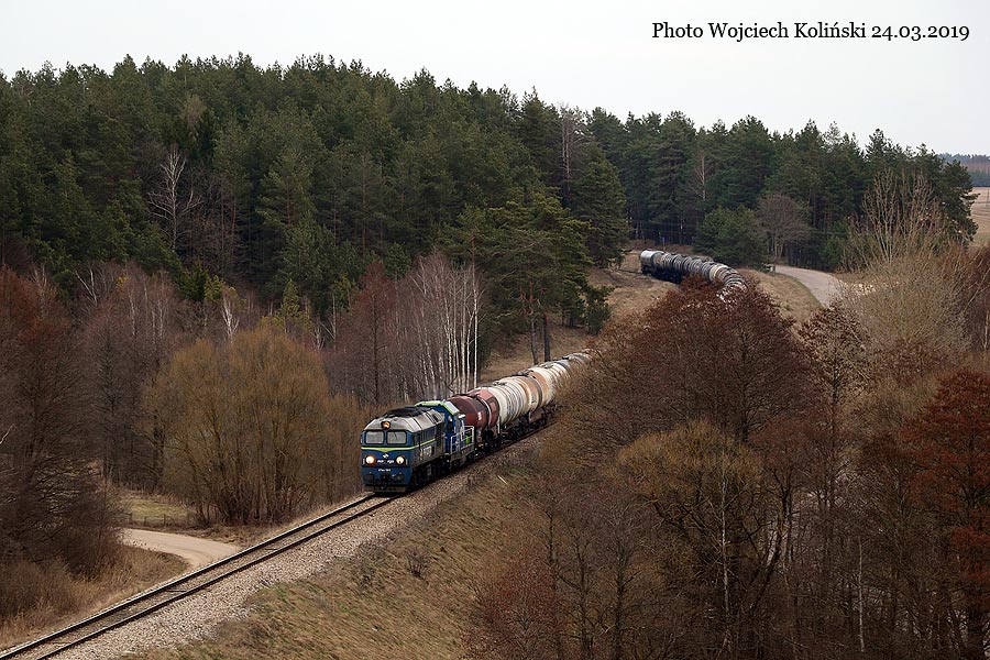 PKP Cargo ST44-1101 + SM42-1273 with the freight train Mockava (Lithuania) - Suwalki 24.03.2019, track Okuniowiec - Suwalki Photo W. Kolins |