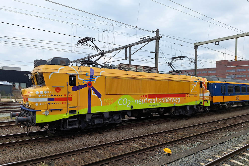 Strukton - The Netherlands Strukton electric locomotive nr. 1824 (bought second-hand from NS) and old diesel locomotive 302282 (once NS 2282) are seen shunting in the station of Amersfoort. The electric locomotive is to be rebuilt as a hybrid locomotive with batteries, to be able to operate without overhead power supply. Amersfoort, 9 April 2020