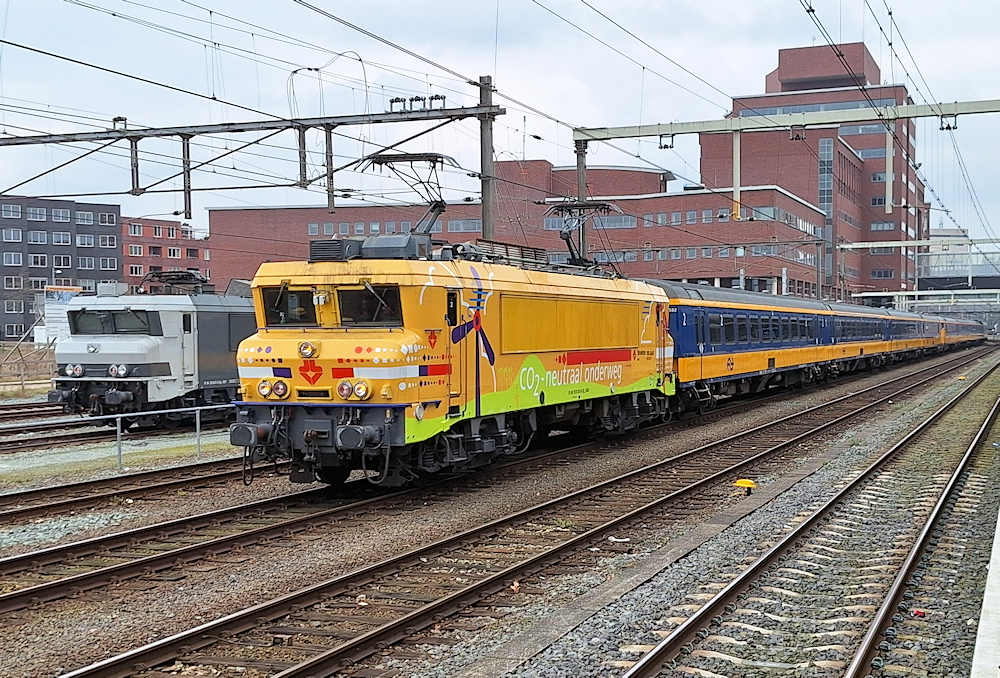 Strukton - The Netherlands Transport of 12 withdrawn NS class ICRm coaches. They have probably been sold as they are very clean. Strukton electric locomotive "Nicole" 91 84 1570 824, former NS nr. 1824 and originally nr. 1624, hauls the train. Amersfoort, 10-03-2026