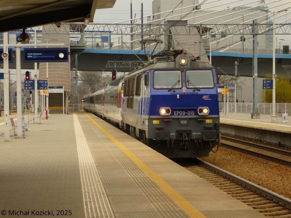 PKP IC EP09-015 is stopping at Krakow Plaszow with IC "Porta Moravica" from Przemysl Gl. to Graz Hbf, Poland, 24.03.2025.
