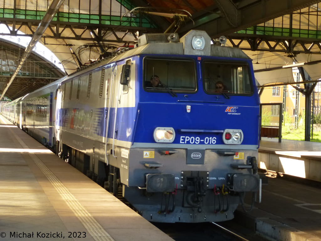 PKP IC EP09-016 with EIC "Panorama" stock from Warsaw will leave Wroclaw Gl. for the neighbouring maintenance yard, Poland, 30.04.2023.