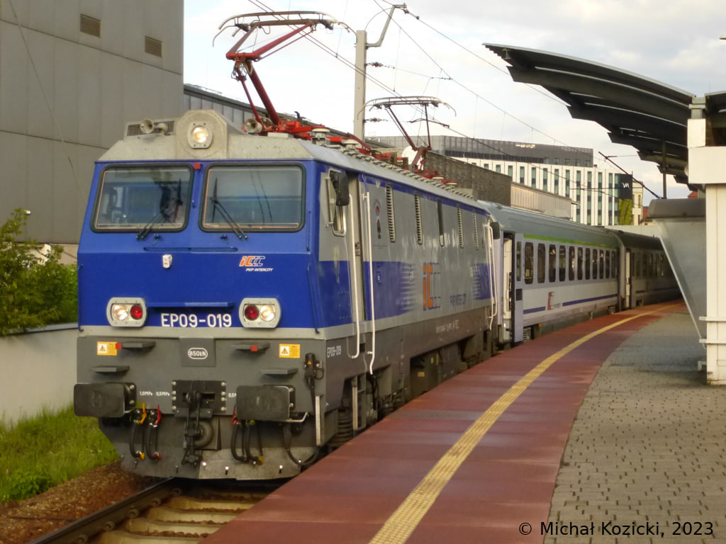 PKP IC EP09-019 with IC "Sobieski" train from Gdynia to Vienna makes a stop at Katowice, Poland, 16.09.2022.