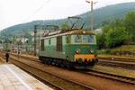 Polish electric locomotive (based on Russian one), ET21-429 with passenger train 'Bieszczady' from Krynica (and Zagorz) to Gliwice, reaches Nowy Sacz station (August 13, 1997).