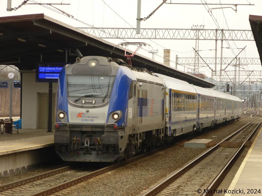 PKP IC EU160-016 makes a stop in Jelenia Gora with IC "Sniezka" from Warsaw to Szklarska Poreba, Poland, 02.03.2024.
