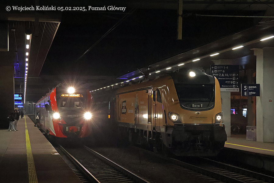 PKP Intercity EU160-017 with the passenger train Berlin - Warszawa Wschodnia and 36WEh-026 as the passenger train Poznan Glowny - Wagrowiec 05.02.2025, Poznan Glowny Photo W. Kolins |