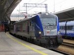 An electric locomotive EU 160-021 Griffin with number 91 51 5 170 108 - 2 of PKP ( Polskie Koleje Panstwowe / Polish Railways) at ralway station Krakow Gl. with TLK 35104 "Malopolska" from Zakopane to Gdynia Gl.