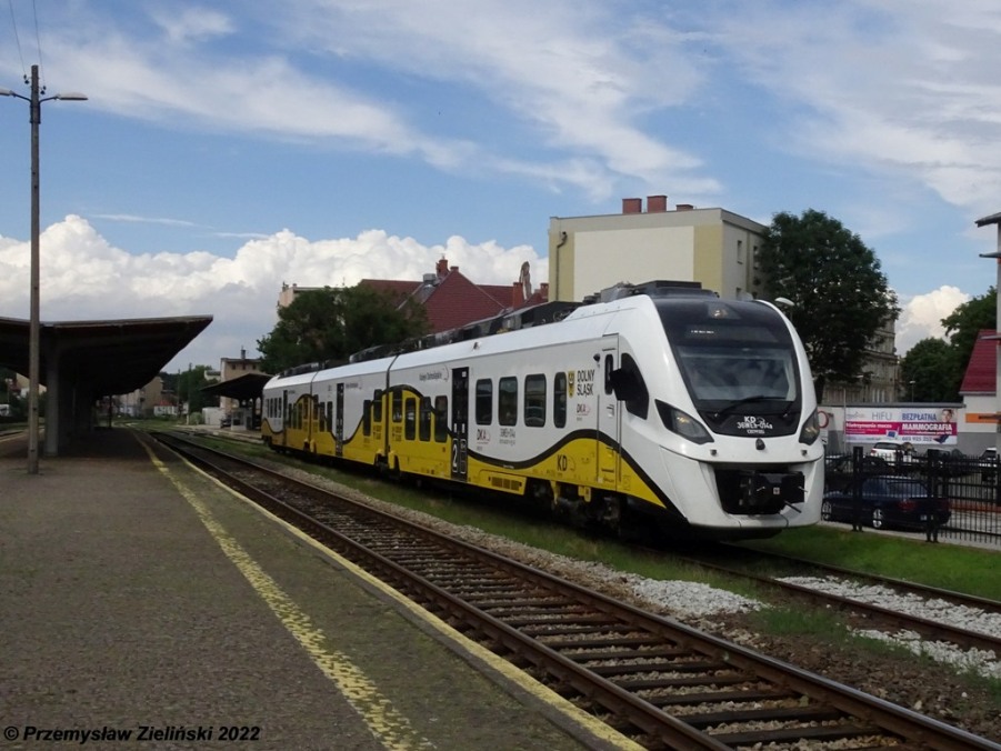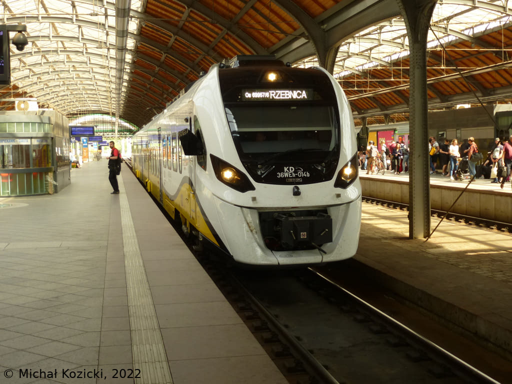 KD 36WEh-014 will depart from Wroclaw Gl. on a service to Trzebnica, Poland, 03.06.2022.