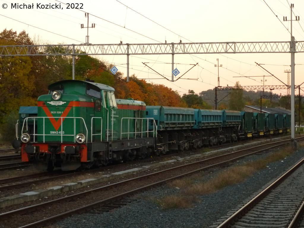 Cargounit SM42-633 with a short train of empty Dolkom gravel dumpers and ballast hoppers stands at Jelenia Gora, Poland, 09.10.2022.