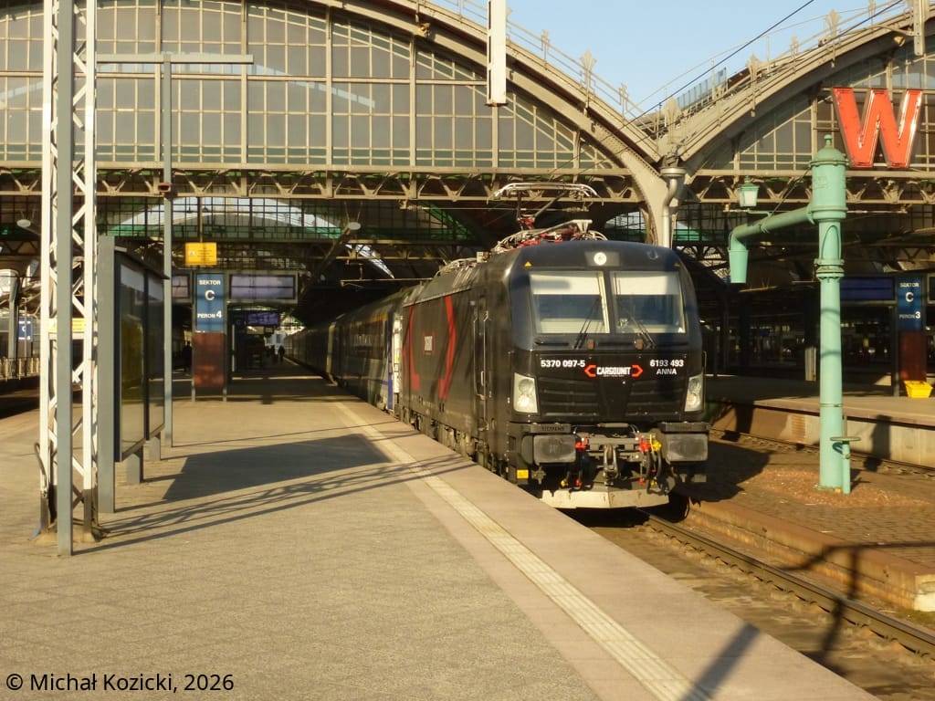Cargounit 5 370 097-5 (6193 493) on lease to PKP IC is stopping in Wroclaw Gl. on the IC "Baltic Express" service from Gdynia to Prague, Poland, 07.03.2026.