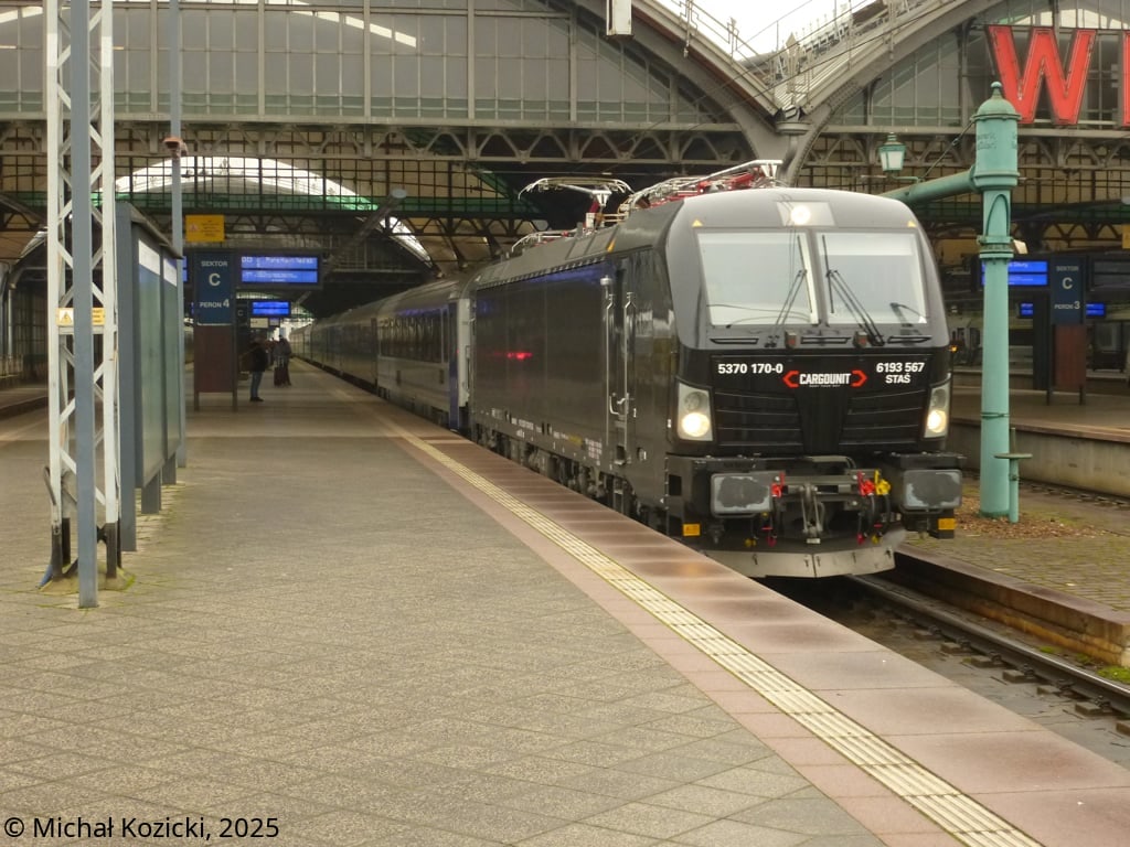 Cargounit 5 370 095-9 (6193 491) hired to PKP IC is stopping at Wroclaw Gl. on the "Baltic Express" IC service from Prague to Gdynia, Poland, 11.10.2025.