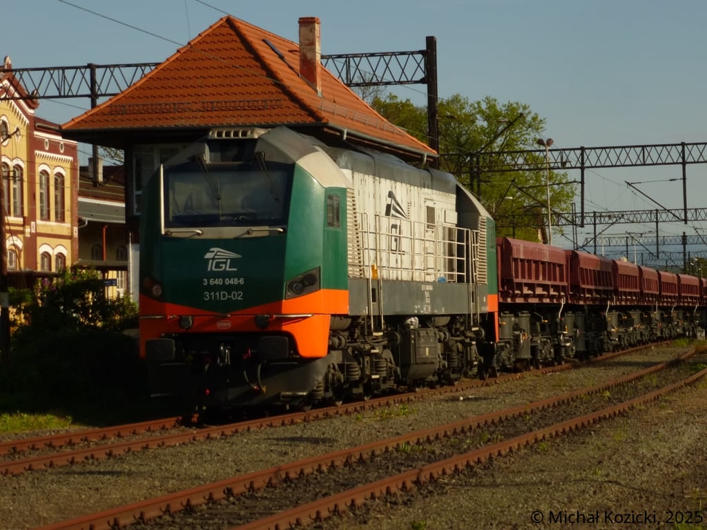 IGL 311D-02 with a rake of gravel dumpers to the basalt quarry in Zareba is seen sidetracked at station Luban Slaski, Poland, 28.04.2025.