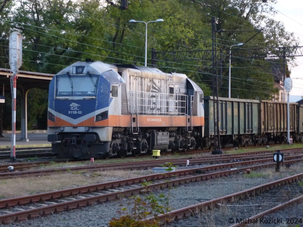 IGL 311D-22 with a rake of open wagons to be loaded with aggregate in Zareba is seen standing idle in Luban Slaski, Poland, 14.10.2024.