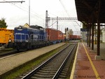 Orion Kolej SM42-2303 is pushing a container train to the container terminal siding in Katy Wroclawskie, Poland, 14.10.2023.