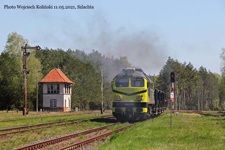 Pomorskie Przedsiebiorstwo Mechaniczno-Torowe (PPMT) M62-1705 pushes the train with crushed stone near the Sliwiczki stop 11.05.2021, Szlachta Photo W. Kolins |