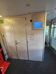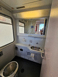 A toilet in a private passenger car type "Avmz", owned by private operator "PIMK Rail Express", part of "PIMK Rail" at railway station Pazardjik in composition of test train.