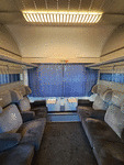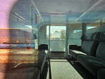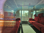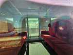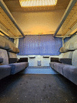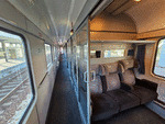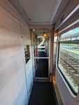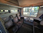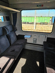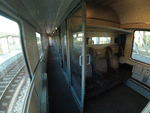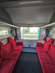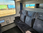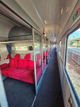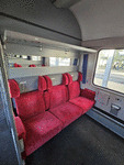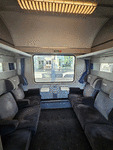 An interior in a private passenger car type "Avmz", owned by private operator "PIMK Rail Express", part of "PIMK Rail" at railway station Pazardjik in composition of test train.