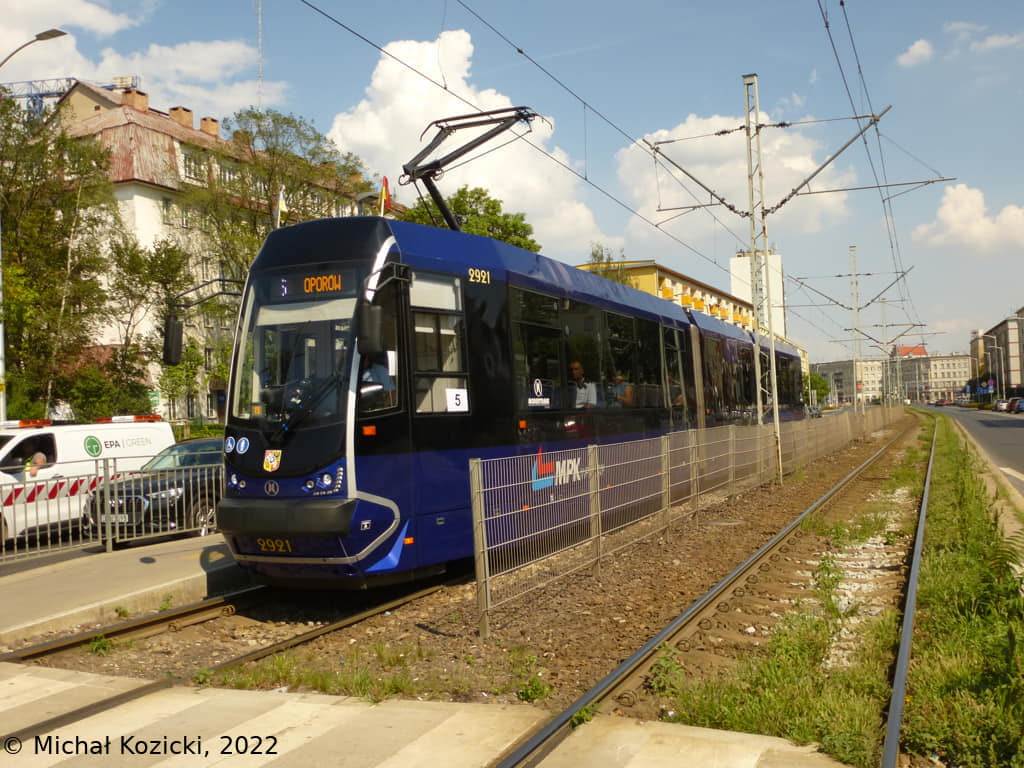 Moderus Beta No. 2921 on route 5 at Kolejowa, Wroclaw, Poland, 17.08.2022.