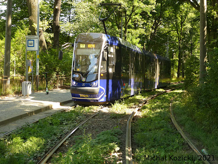Moderus Beta No. 2929 on route 17 is stopping at Chopina, Wroclaw, Poland, 13.08.2021.