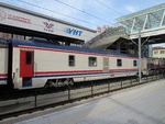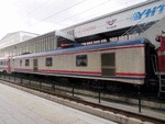A generator car type "J" of TCDD (Turkiye Cumhuriyeti Devlet Demiryollari / Turkish Railways ) standing at railway station Ankara in composition of train "Dogu Ekspresi" to Kars. A video movie about departuring the train you can see on this adress: