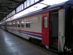 A second class passenger car "WSPlm" of TCDD ( Turkiye Cumhuriyeti Devlet Demiryollari / Turkish Railways ) "Trakya" standing at railway station Istanbul HalkalI in composition of train with number 12702 to KapIkule.