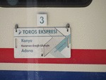 A destination table onto passenger car type "WSPlm" of TCDD (Turkiye Cumhuriyeti Devlet Demiryollari / Turkish Railways ) standing at railway station Konya in composition of train "Toros Ekspresi" to Adana.