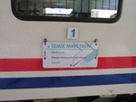 A destination plate onto second class passenger car "WSPlm" of TCDD ( Turkiye Cumhuriyeti Devlet Demiryollari / Turkish Railways ) "Trakya" standing at railway station Istanbul HalkalI in composition of train with number 12704 to Uzunkopru.