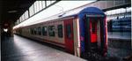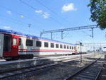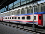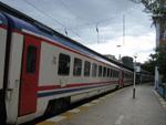 A passenger car "WSPlm" of TCDD ( Turkiye Cumhuriyeti Devlet Demiryollari / Turkish Railways ) standing at railway station HalkalI in composition of Ankara Ekspresi to Ankara.